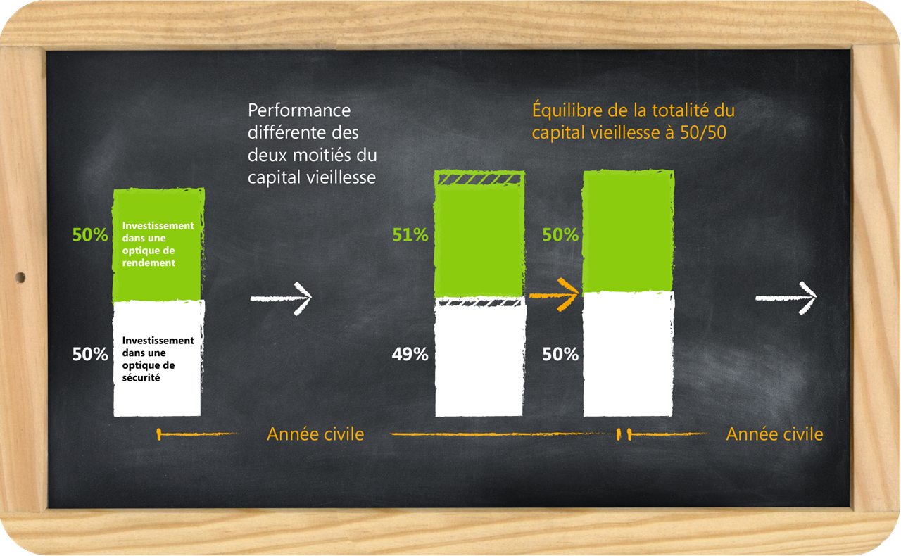Pour chaque moitié du capital vieillesse, il existe une stratégie de placement avec une allocation cible correspondante.