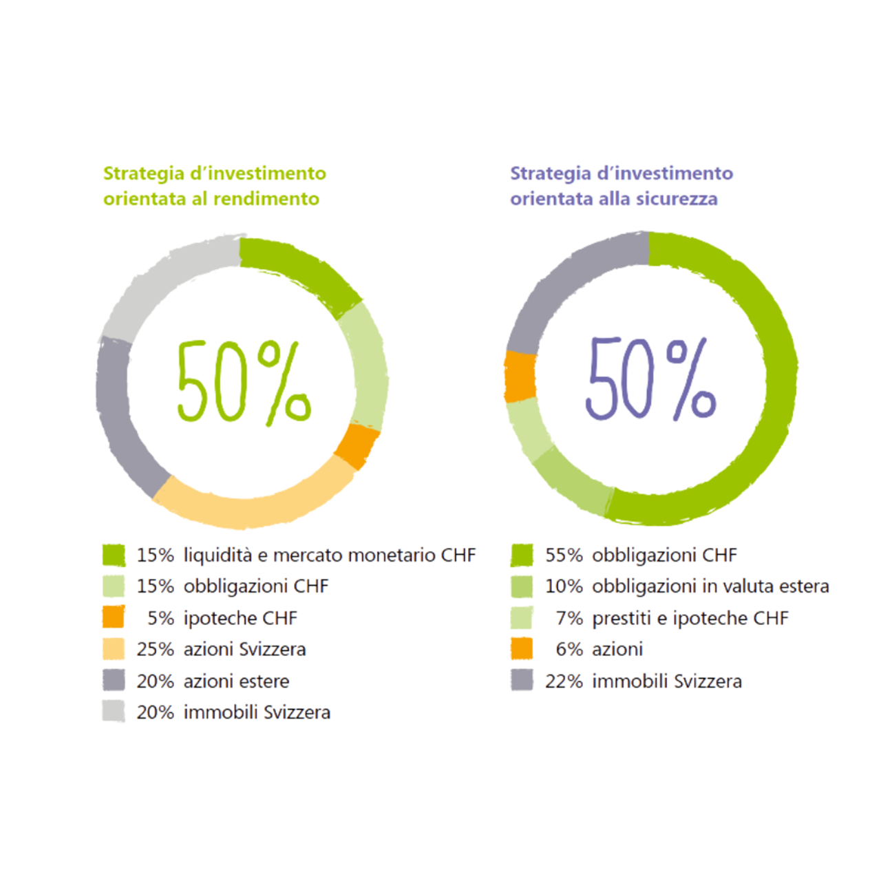 Per ogni metà del capitale di previdenza esiste una strategia d’investimento mirata con una corrispondente allocazione degli obiettivi.
